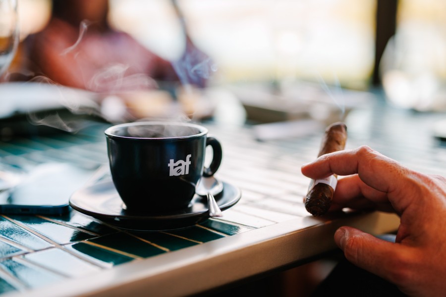 Με το που το φάγαμε κι αυτό, και ακούμπησαν τα πιρούνια στο τραπέζι, σαν να δόθηκε κάποιο σιωπηλό σύνθημα, όλοι βγήκαν στην βεράντα για να απολαύσουν το γλυκό ή το κρουασάν τους με πληθωρικό espresso Competition Blend της Taf, πούρο και ακόμα περισσότερη σαμπάνια.