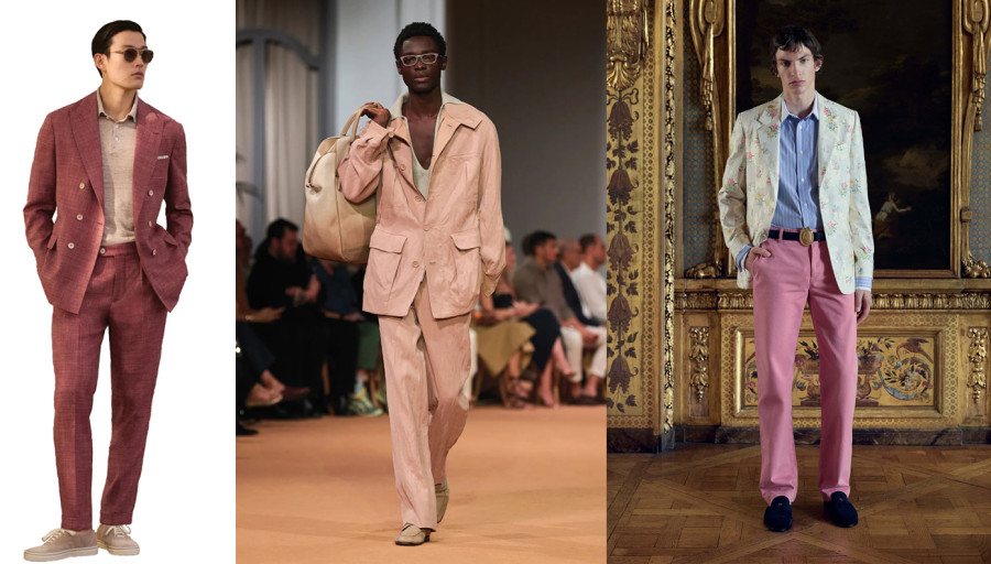 Η παρουσία του ροζ χρώματος στα ανδρικά ρούχα δεν είναι σύγχρονο φαινόμενο, καθώς ιστορικά, το ροζ θεωρούνταν ανδρικό χρώμα, συνδεδεμένο με τη δύναμη και την εξουσία, πριν καθιερωθεί ως «γυναικείο» στις αρχές του 20ου αιώνα. Εμφανίζεται με δυναμικό τρόπο την εποχή της Αναγέννησης και του Ροκοκό, κατά τον 17ο και 18ο αιώνα, όταν οι Ευρωπαίοι αριστοκράτες φορούσαν ροζ ανδρικά σύνολα και γιλέκα, ιδιαίτερα κατά τον 18ο αιώνα και κατά τη διάρκεια της βασιλείας του Λουδοβίκου ΙΕ. Μια περίοδο που το ροζ, είχε συνδεθεί με τον πλούτο και την κομψότητα, πολύ πριν οι σύγχρονοι ενδυματολογικοί παράγοντες περιορίσουν την παλέτα των αποχρώσεων του στα ανδρικά ενδύματα. Είτε φορεμένο διακριτικά κάτω από ένα μπλε σκούρο κοστούμι είτε φορεμένο ως κυρίαρχο χρώμα ενός κοστουμιού, οι συλλογές της άνοιξης το παρουσιάζουν, εκ νέου, ως ένα χρώμα με αυτοπεποίθηση για την ανδρική ένδυση. Οι σύγχρονες αποχρώσεις είναι σαφώς πιο απαλές και ουδέτερες, καθώς το ροζ αναμιγνύεται στη σύνθεση του με λίγο μαύρο ώστε να χάσει την φανταχτερή του υπόσταση και να ταιριάζει εύκολα ακόμα και σε μια υπάρχουσα, κλασσική ανδρική γκαρνταρόμπα.