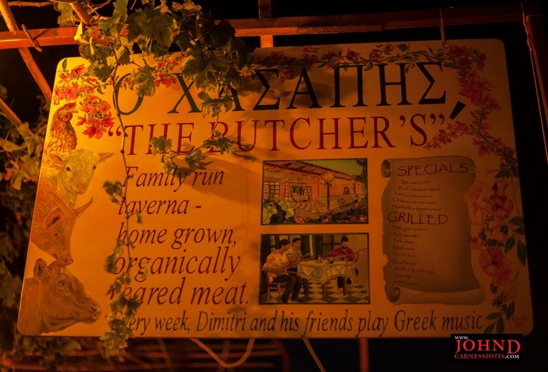 Για το βράδυ, το χωριό προσφέρει ποικιλία εστιατορίων. Personal favorites, το κουκλίστικο ιταλικό «Ρόδι», περίπου στην μέση της παραλίας, για εξαιρετική pizza και al dente καταστάσεις, με πολύ φιλική εξυπηρέτηση και free wi-fi, και, επίσης, ο Χασάπης «The Butcher» . Σερβίρει, μεταξύ πολλών άλλων κρεατικών, ένα από τα καλύτερα ψητά γουρουνόπουλα, που έχω δοκιμάσει και που σου έρχεται ψιλοκομμένο και ξεκοκκαλισμένο στο πιάτο.
