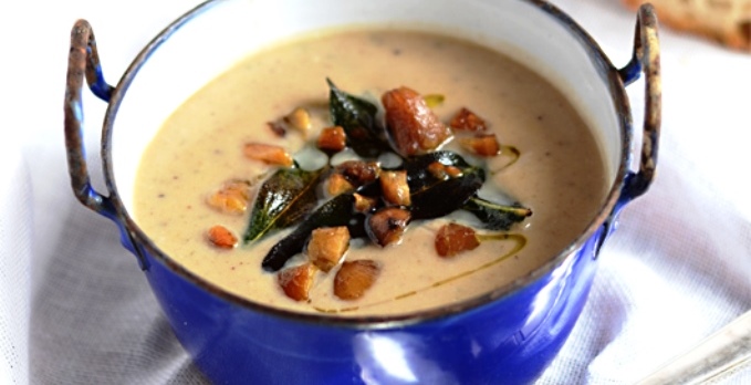 Ταυτόχρονα, σε ένα μικρό τηγάνι, ζεσταίνουμε το υπόλοιπο ελαιόλαδο και όταν κάψει, τηγανίζουμε τα φύλλα του φασκόμηλου μέχρι να γίνουν τραγανά. Τα τοποθετούμε σε αποροφητικό χαρτί, θρυματίζουμε με τα δάχτυλα μας τα κάστανα που έχουμε κρατήσει στην άκρη και σερβίρουμε την σούπα ζεστή, σε μπωλ, διακοσμημένα με τα φύλλα του φασκόμηλου και crumbles κάστανου.