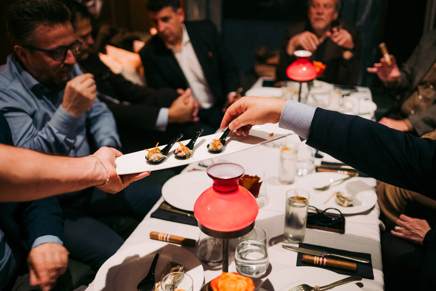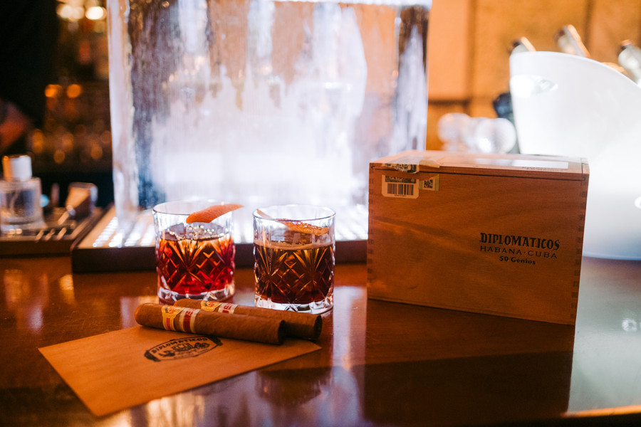 Η παρέλαση των finger-food είχε ήδη ξεκινήσει και τα στρείδια, ένα σουβλάκι γαρίδα (horseradish / kefir / lime), ceviche classico, το banana bbq pork short ribs και τα pulled duck bao buns συνδυάστηκαν όμορφα με το πρώτο κοκτέιλ της βραδιάς. Τα πούρα βέβαια είχαν ανάψει ήδη, πριν καν σερβιριστεί το δεύτερο κοκτέιλ της βραδιάς που είχαμε σχεδιάσει ως πρώτο συνοδευτικό του πούρου: ένα Código Boulevardier (Código 1530 Tequila Anejo, Vermouths blend & Italian bitter).