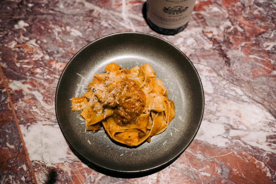 Τα πρώτα πιάτα, μια πληθωρική Wagyu bolognese και μια Crispy duck με sauce hoisin-πορτοκάλι ταίριαξαν θαυμάσια με το Châteauneuf-du-Pape, το Les Sinards 2023 της Famille Perrin. Πρόκειται, κατά κάποιο τρόπο, για τη δεύτερη ετικέτα του Beaucastel καθώς προέρχεται από τα νεότερα αμπέλια του και δύο γειτονικούς αμπελώνες, ενώ εδώ χρησιμοποιούνται αποκλειστικά Grenache, Mourvèdre & Syrah. Ένα θαυμάσιο, τυπικό Châteauneuf με εξαιρετική σχέση ποιότητας και τιμής που σε εισάγει κατά έναν τρόπο στη μαγεία του Beaucastel που βγήκε μετά.