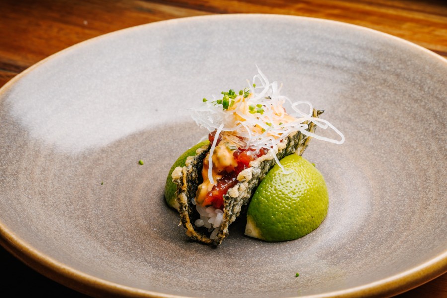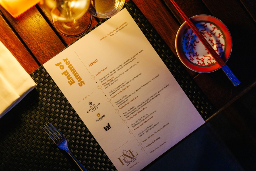 Το σερβίρισμα ξεκίνησε στις 21:00 με Nori tacos με ταρτάρ τόνου με yuzu kosho & φρέσκο wasabi, σε τραγανό φύκι nori – συνοδεία σάλτσας wafu, τα οποία συνδυάστηκαν στην εντέλεια με μια Clear Margarita φτιαγμένη με Código1530 Blanco, Perrier-Jouët και citrus mix. Η φινετσάτη tequila Código1530 Blanco μαζί με το «σιρόπι» της σαμπάνιας έδωσαν ένα γαστρονομικό, υπέρκομψο κοκτέιλ ιδανικό για το τραπέζι!