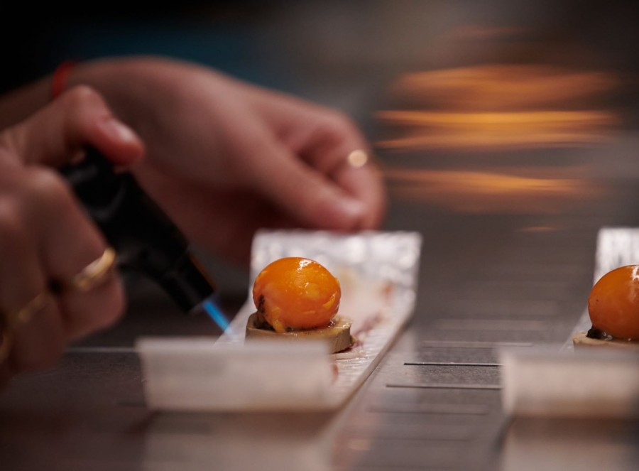 Η είσοδος από μόνη της είναι μια τελετουργία. Πριν καν συνειδητοποιήσετε ότι το δείπνο έχει αρχίσει, σας πλησιάζει κάποιος και σας προσφέρει ένα ποτηράκι Pisco Italia με cava. Η πρώτη αίθουσα θυμίζει ψυχρό εργαστήριο – ένα λευκό, γυαλισμένο δωμάτιο που ακροβατεί ανάμεσα στο σύμπαν του Dexter και σε μια κωμωδία του Woody Allen. Οι γάντζοι είναι άδειοι, η θερμοκρασία ουδέτερη και, από ένα παράθυρο μοναστηριακού τύπου, εμφανίζονται τα πρώτα μικρά πιάτα: piparra, boquerón.