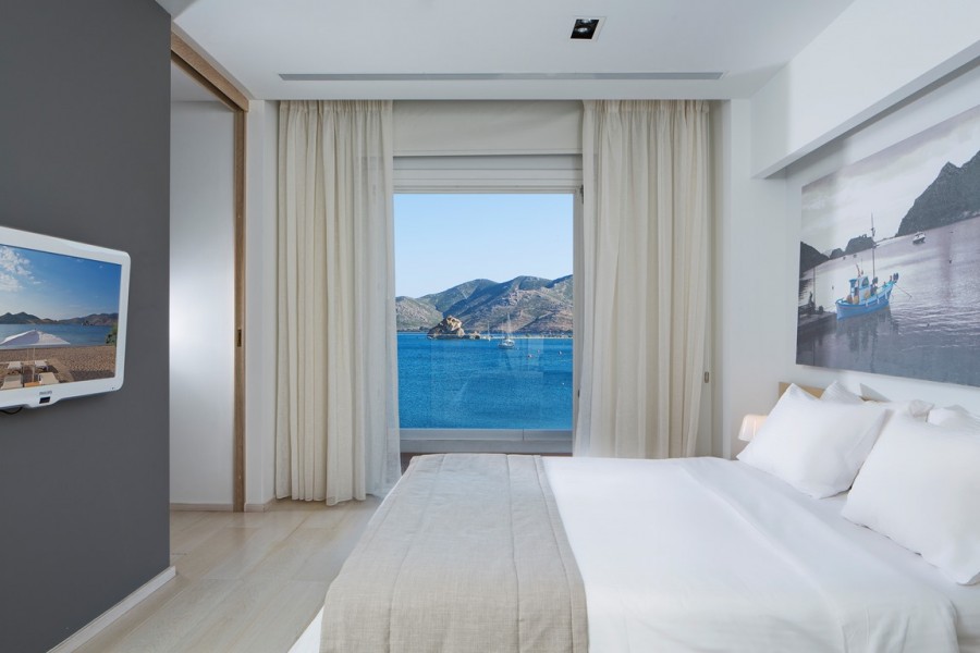 Στο εσωτερικό των δωματίων κυριαρχεί η λιτή διακόσμηση, που συμβαδίζει με την απλή ζωή του νησιού και αγκαλιάζεται από απαλούς γήινους χρωματισμούς που δένουν με το υπόλοιπο σκηνικό. Όλα τα δωμάτια του κεντρικού κτηρίου έχουν θέα προς τον κόλπο και τα ήρεμα νερά του, που το βράδυ γίνεται ακόμα πιο εντυπωσιακός. Στην μπροστινή παραλία μπήκαν ομπρέλες και ξαπλώστρες σε δύο σειρές, που όμως δεν φτάνουν μέχρι εκεί που σκάει το κύμα ώστε να «κακοποιούν» το φυσικό περιβάλλον και να ενοχλούν την περατζάδα των υπόλοιπων επισκεπτών.