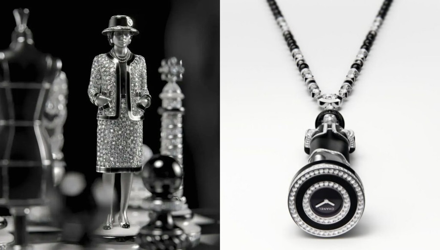 Ωστόσο, η σκακιέρα ήταν αυτή που αποτέλεσε τη μεγαλύτερη τεχνική πρόκληση, με τον Grangié να την περιγράφει ως «μακράν το πιο περίπλοκο έργο κατασκευαστικά που ποτέ αποτολμήσαμε». Χρειάστηκαν περίπου τρία χρόνια για να αναπτυχθεί το σετ, το οποίο, όπως λέει, πουλήθηκε πριν από την έκθεση σε έναν πελάτη με έδρα το Ηνωμένο Βασίλειο, ο οποίος το εκτίμησε ως έργο τέχνης. Κάθε πιόνι στο περίφημο αυτό σκάκι είναι ένα γνωστό σύμβολο Chanel. Η μορφή μάλιστα της, παίρνει τη θέση της βασίλισσας, ενώ αν την ανασηκώσετε, θα ανακαλύψετε κάτω από τη βάση της ένα κρυμμένο ρολόι. Το ταγιέρ της είναι διακοσμημένο με διαμάντια, ενώ η φιγούρα της μπορεί να φορεθεί και ως κολιέ. Βασιλιάς γίνεται το λιοντάρι, οι επίσκοποι είναι κούκλε υψηλής ραπτικής, ενώ οι ιππότες είναι τα άλογα. Όλη η σκακιέρα λειτουργεί ως αντανάκλαση του σύμπαντος της Chanel και τα πιόνια είναι κατασκευασμένα από χρυσό, διαμάντια και κεραμικό. Η Chanel χρησιμοποιεί κεραμικό στην ωρολογοποιία της εδώ και 26 χρόνια, από το 2.000, όμως το συγκεκριμένο σετ για το σκάκι, απαιτούσε ένα νέο επίπεδο ακρίβειας, συμπεριλαμβανομένης της δημιουργίας καλουπιών για κάθε ένα από τα πιόνια στα κεραμικά τετράγωνα του ταμπλό. Τα διαμάντια στο σακάκι της Chanel είναι τοποθετημένα με τέτοιο τρόπο που να θυμίζει ύφασμα τουίντ, ενώ ο οίκος για αυτή την μοναδικότητα τοποθέτησης, ζητά δίπλωμα ευρεσιτεχνίας.