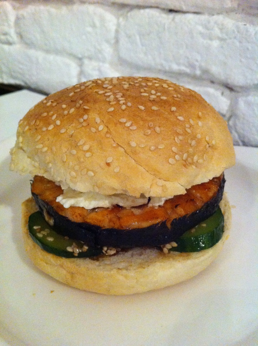 Burger Σολομού με αγγούρι, teriyaki και cream cheese.