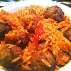 Σε ένα ρηχό και πλατύ σκεύος - εγώ χρησιμοποιώ ένα πλακερό της Green Farm που με έχει βολέψει πάρα πολύ- βάζετε τρεις κουταλιές της σούπας ελαιόλαδο, ένα κρεμμύδι ψιλοκομμένο, δυο κουτιά ντοματάκια Santos, αλάτι πιπέρι και λίγη ρίγανη , τα ανακατεύετε καλά και τα αφήνετε να πάρουν μια δυο βράσεις. Στο μεταξύ διαλύετε σε 250 ml καυτό νερό δυο κουταλάκια του γλυκού Borvil ή ένα κουτάκι ζελέ βοδινού Knorr. Ρίχνετε μέσα στην κατσαρόλα ένα πακέτο των 500 γρ. κριθαράκι χοντρό και στην συνέχεια προσθέτετε τον ζωμό σταδιακά έτσι ώστε το ζυμαρικό να έχει πάντα ζουμί ανακατεύοντας συνέχεια για να μην κολλήσει. Σύνολο θα χρειαστεί βράσιμο περίπου 16-18 λεπτά ανάλογα με το τι γράφει επάνω η συσκευασία. Στα μισά προσθέστε και ένα ποτήρι λευκό κρασί. Όταν η μανέστρα είναι σχεδόν έτοιμη, ρίξτε μέσα στην κατσαρόλα τα κεφτεδάκια και αφήστε τα να πάρουν μια βράση. Το φαγητό πρέπει να έχει ζουμάκι αλλά να μην κολυμπάει. Σερβίρετε με τριμμένο κεφαλοτύρι. Αν σας αρέσουν οι πιο spicy γεύσεις, μπορείτε να προσθέσετε από την αρχή και δυο πιπερίτσες καυτερές μέσα στην σάλτσα.