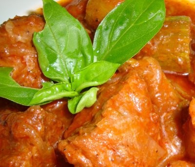 Σοτάρουμε τα κρεμύδια και το σκόρδο με μια κουταλιά ελαιόλαδο σε μέτρια φωτιά μέχρι να γίνουν διάφανα. Τα αφαιρούμε από την κατασαρόλα με μια κουτάλα, δυναμώνουμε την φωτιά και ρίχνουμε το κρέας με το υπόλοιπο ελαιόλαδο γυρίζοντας το συνέχεια γιανα θωρακιστεί. Μόλις πάρει χρώμα σβήνουμε με το κρασί. Προσθέτουμε τα κρεμμύδια με το σκόρδο, τα ντοματάκια (φρέσκα και κονσέρβα), το ξύδι,την ζάχαρη, τα μπαχαρικά ,τις πιπερίτσες, το αλατοπίπερο και ελάχιστο νερό ζεστό και χαμηλώνουμε την θερμοκρασία. Σιγοβράζουμε γύρω στην 1.30 ώρα, ή όσο χρειαστεί για να μαλακώσει το κρέας καλά. Το μυστικό είναι πάντα στα καλά υλικά και στο να έχουμε το νου μας έτσι ώστε να προσθέτουμε νερό αν χρειαστεί χωρίς όμως να αφήσουμε την σάλτσα να αραιώσει. Ταιριάζει υπέροχα με πατάτες τηγανητές, μακαρόνια ή πουρέ ανάλογα τα γούστα σας. Και είναι ένα φαγητό που μυρίζει αγάπη και ζεστασιά.