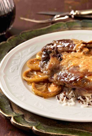 Γιορτινό αρνάκι γάλακτος στη γάστρα με αγριόρυζο, καραμελωμένα γλυκολέμονα και σάλτσα κατσικίσιου τυριού