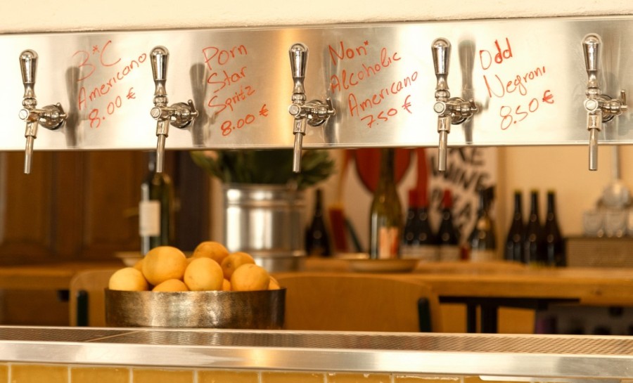Το πιο ιδιαίτερο στοιχείο όμως βρίσκεται πίσω από μια πόρτα-ψυγείο. Εκεί κρύβεται το μικρό speakeasy εργαστήριο του El Mio, ένα δωμάτιο με δικό του χαμηλό παραθυράκι στο μπαρ, το οποίο σερβίρει cocktail από taps. Όχι ένα και δύο αλλά οκτώ επιλογές. Ο κατάλογος των cocktails (όπου συμπεριλαμβάνονται τα tap) είναι γεμάτος με συνταγές που μπλέκουν ελληνικά spirits με ενδιαφέροντα αρώματα: tomato gin, passion fruit, fig vodka και cold brew.