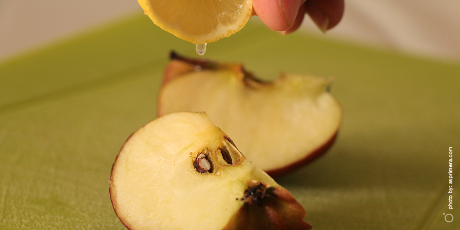 Το μαύρισμα του μήλου μόλις κοπεί είναι μια φυσική αντίδραση που ονομάζεται ενζυμική αμαύρωση. Κατά την αντίδραση αυτή, η επαφή με το οξυγόνο μετατρέπει τις φαινολικές ενώσεις των τροφίμων σε μελανίνες. Μπορούμε λοιπόν πολύ απλά να ραντίσουμε τα κομμάτια του μήλου με λίγο λεμόνι. Το κιτρικό οξύ του λεμονιού θα ρίξει το ph κοντά στο 4 και θα αναστείλει τη δράση του ενζύμου που χρειάζεται ph 6 έως 7. Πολύ επιστήμη αλλά με αυτό τον τρόπο τα μήλα μας θα διατηρήσουν το χρώμα τους.